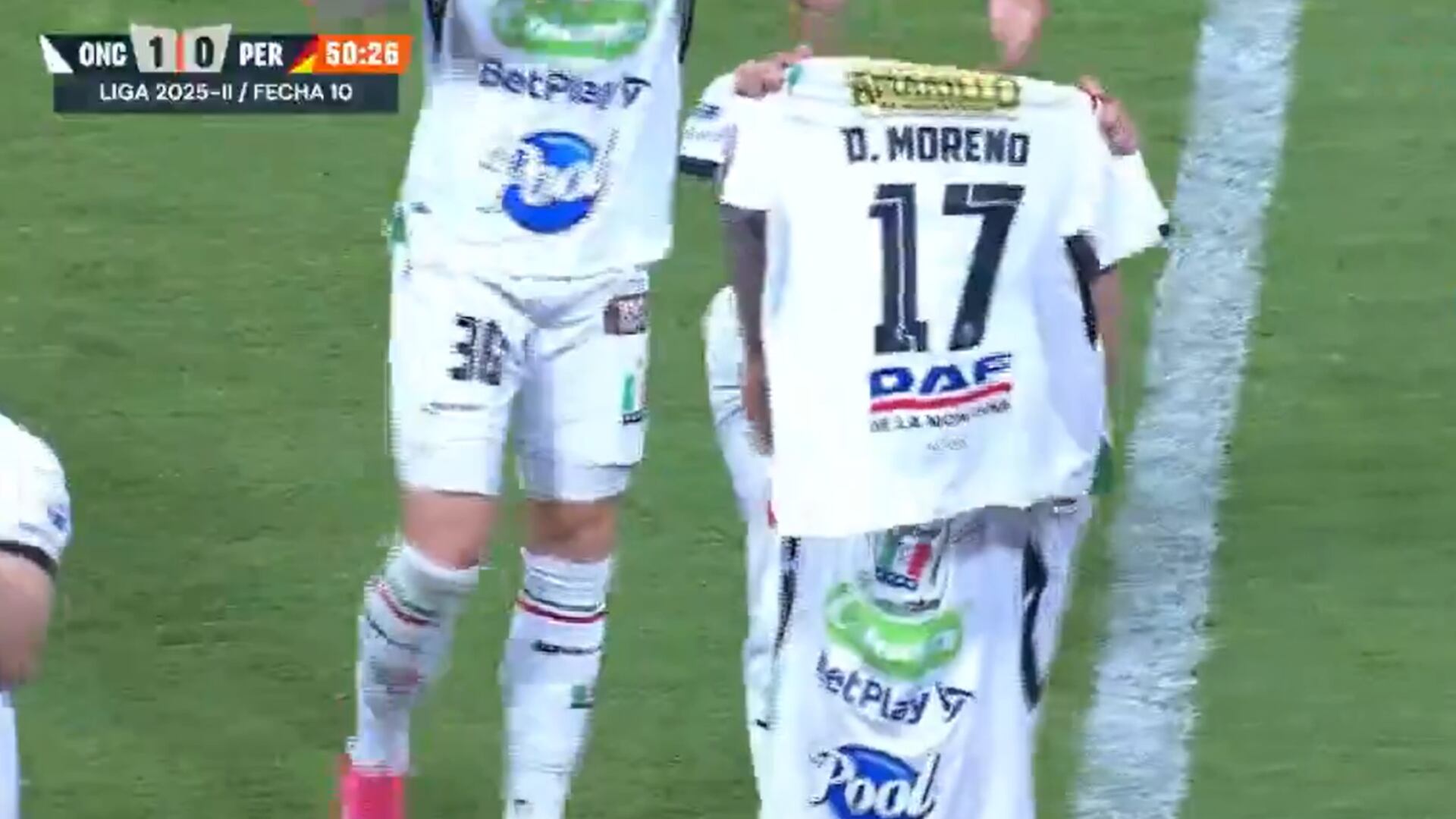 Jefry Zapata fue el encargado de abrir el marcador para Once Caldas en el Estadio Palogrande de Manizales al minuto 49 y no se olvidó de Dayro Moreno, pues aprovecharon para sacar una camiseta del goleador.