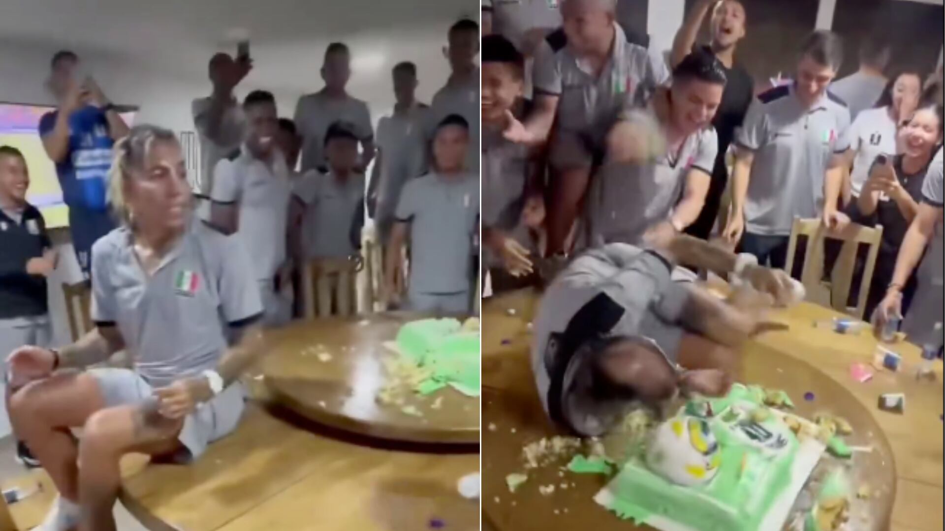Antes de su viaje a Ecuador para concentrarse de cara al partido por los cuartos de final contra Independiente del Valle, el plantel de Once Caldas le partió una torta a Dayro Moreno, le dieron vueltas sobre la mesa mientras lo llenaban de pastel.