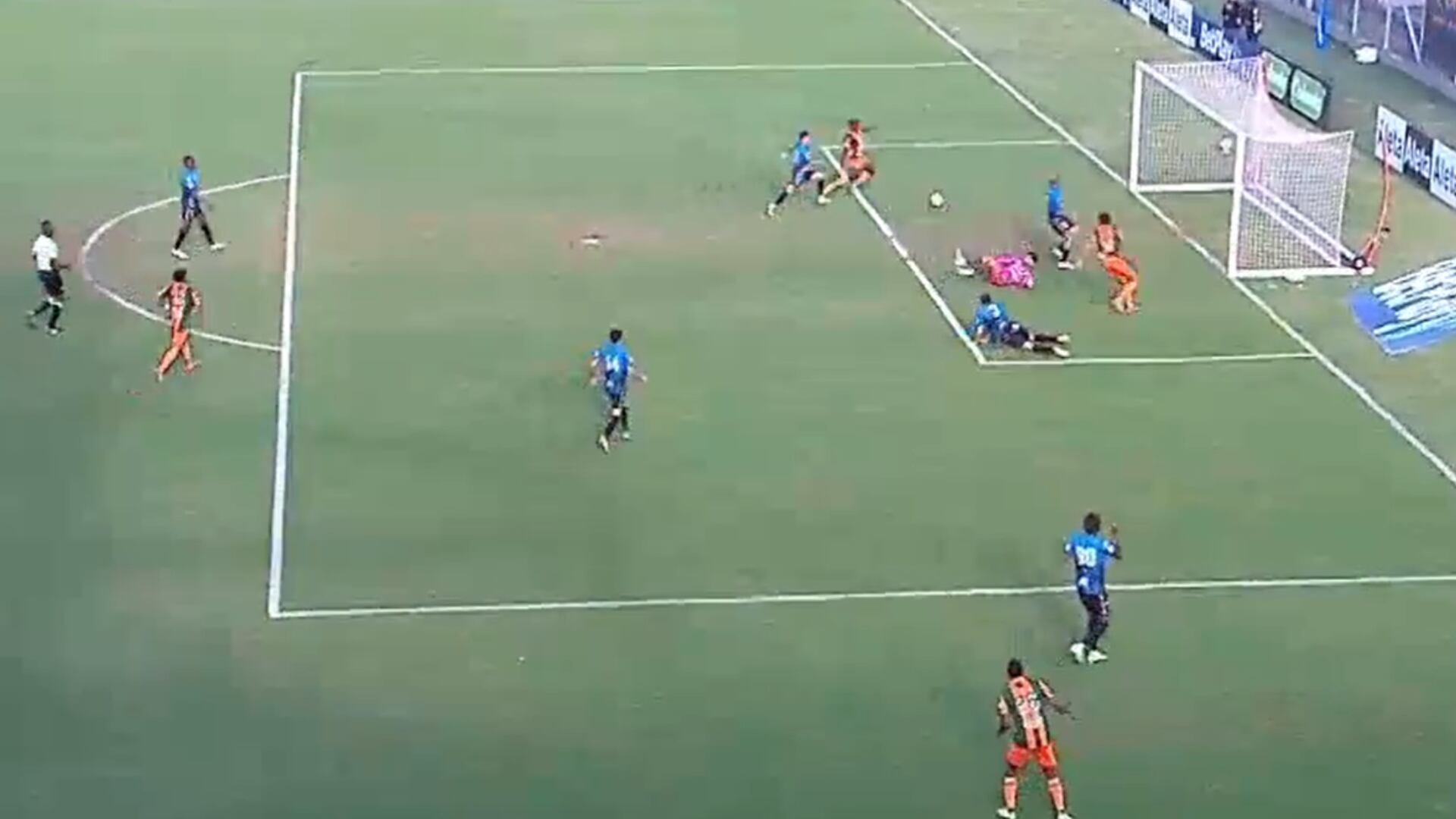 Dairon Valencia llegó hasta la línea final del Deportivo Pereira y lanzó un centro rastrero buscando al delantero Santiago Londoño, quien no pudo contactar el balón, sino que lo dejó pasar para la llegada más cómoda de Luis Ángel Díaz, dejando por el camino al arquero Salvador Ichazo.