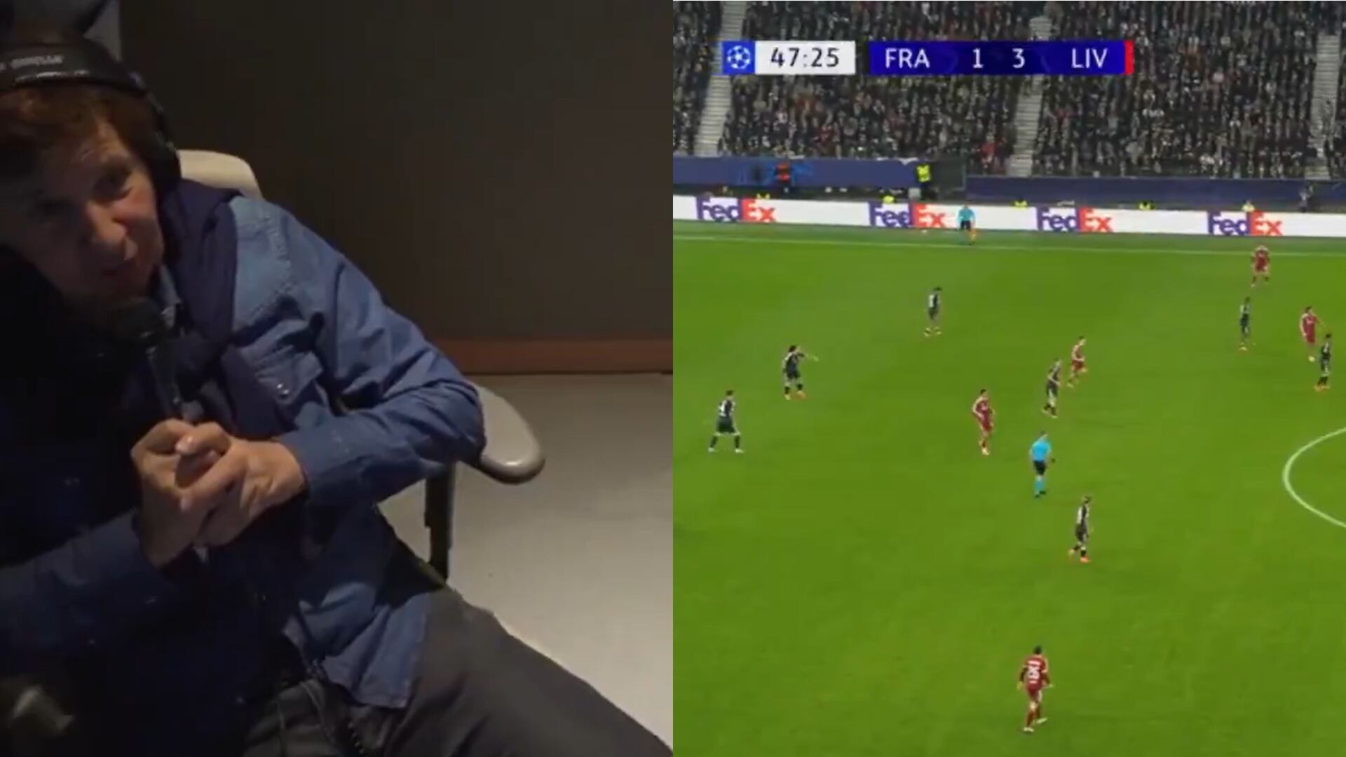 Uno de los hechos más curiosos que nos ha dejado la UEFA Champions League en lo que va de temporada fue el que vimos en la transmisión para Sudamericana de ESPN del juego entre Eintracht Frankfurt y Liverpool, donde recién comenzó el segundo tiempo, la cámara ponchó la cabina en la que se estaba narrando el encuentro, mostrando al narrador famoso ‘Bambino’ Pons, su compañero de transmisión y una mujer que salió corriendo como si de eso dependiera su vida.