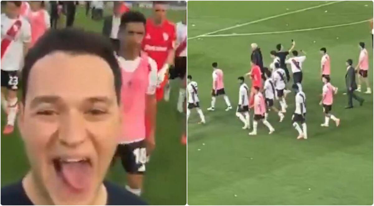 Precisamente aprovechando esto, un hombre que estaba dentro de la cancha decidió filmarse mientras se burlaba de los jugadores de River que iban pasando por su lado.