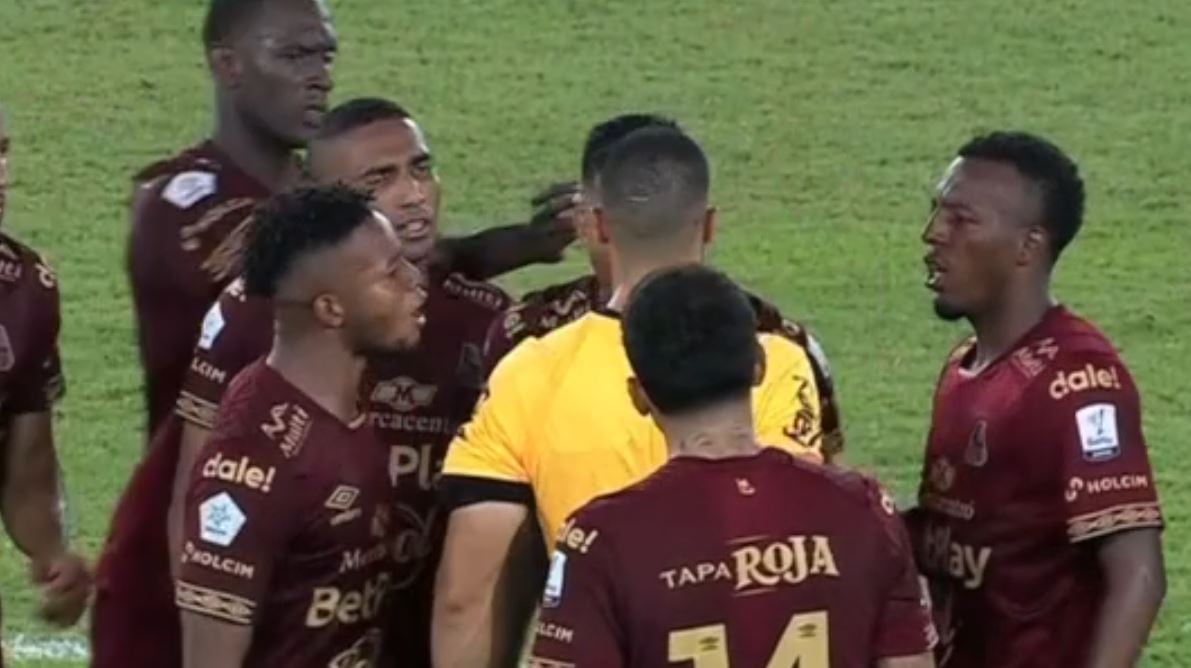 De ‘ladrón’ no bajaron al árbitro Alejandro Moncada y a uno de sus asistentes, los jugadores de Deportes Tolima, en medio del partido contra Junior en el arranque del fútbol colombiano que reeditó la última final del FPC.