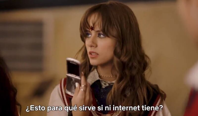 “Un discman, “Pásame la botella”, “Yo quisiera” de Reik, la factoría...”, dice Esteban, interpretado por Sergio Mayer Mori. “¿Esto para qué sirve si ni Internet tiene?”, dice Jana (Azul Guaita), mientras muestra un celular.