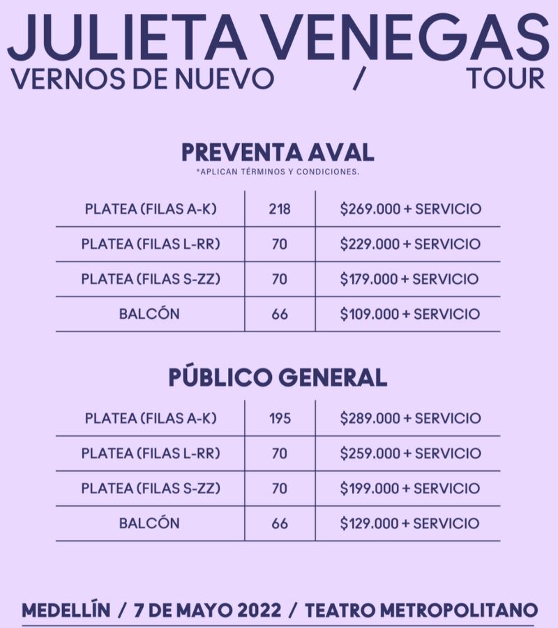 En medio de rumores de un nuevo disco y después de conciertos en Argentina y México, Julieta Venegas viene a vernos de nuevo para hacernos cantar y gozar con sus éxitos. Cabe resaltar que el inicio de venta de boletería será el 24 de Enero y se podrán conseguir a partir de $139.000 y $129.000 para Bogotá y Medellín respectivamente.