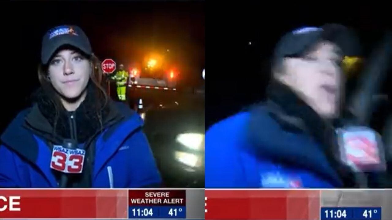 Fue precisamente este desvío junto a las malas condiciones climatológicas del momento lo que hicieron que la persona que manejaba el vehículo haya intentado cruzar sin darse cuenta que la joven periodista se encontraba frente a la cámara. Lo más sorprendente de la situación fue que Tori se levantó como si nada y luego de recuperar el aliento continuó con su reporte.