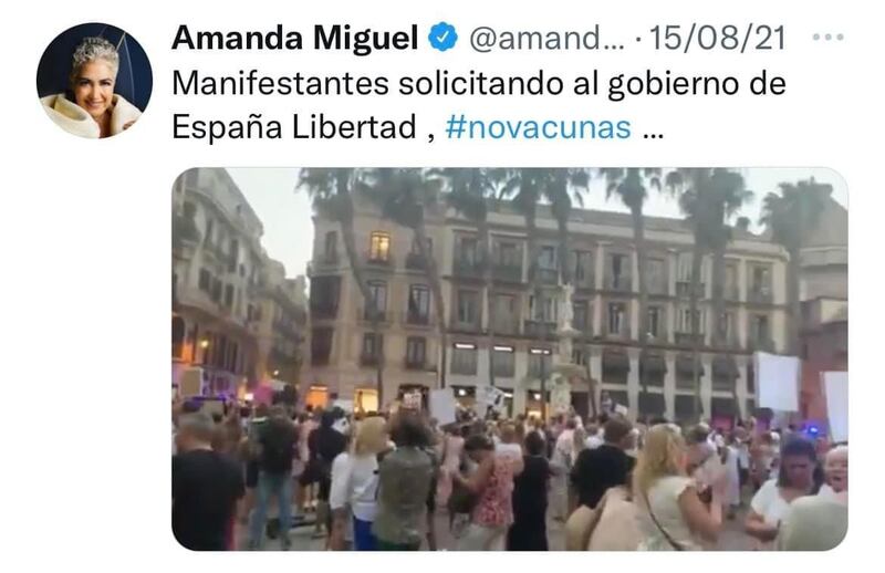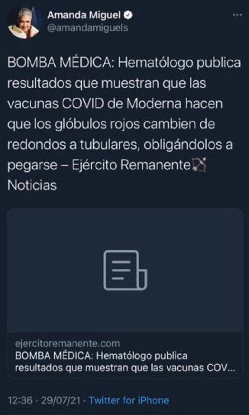 Cuatro meses después, la intérprete de “Él Me Mintió” dijo que la vacuna contra el Covid-19 era parte de “la propaganda” para inocular a las personas con una “vacuna experimental”. Otra evidencia de su postura fue la vez en la cual Amanda publicó en julio de 2021 un estudio que comprueba que la vacuna de Moderna altera la estructura de los glóbulos rojos. Finalmente, la cantante argentina en septiembre de ese mismo año compartió una foto en la que había manifestantes españoles exigiendo “la libertad de no vacunarse”.
