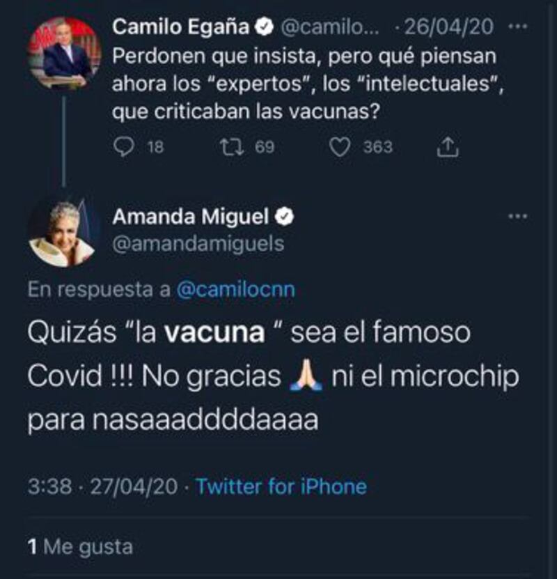 Como ejemplo de ello, los usuarios de Twitter comenzaron a sacar a la luz los tweets más polémicos de Miguel acerca de su postura antivacunas, ideología que quizás también compartía Verdaguer. Todo inició en 2020, cuando Amanda de forma muy abierta comenzó a externar su opinión relacionada con el Covid-19. En abril de ese año, en respuesta a un tweet del periodista Camilo Egaña, la cantante comentó: “Quizás la vacuna sea el famoso Covid!!! No gracias”.