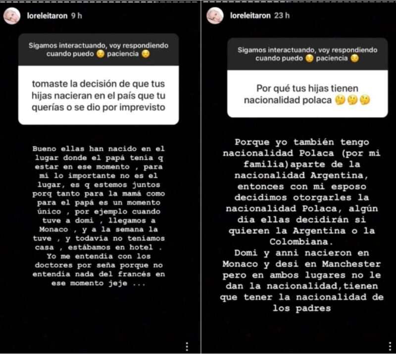 “Porque yo también tengo nacionalidad polaca (por mi familia) aparte de la nacionalidad argentina, entonces con mi esposo decidimos otorgarles la nacionalidad polaca, algún día ellas decidirán si quieren la argentina o la colombiana”, aseguró.