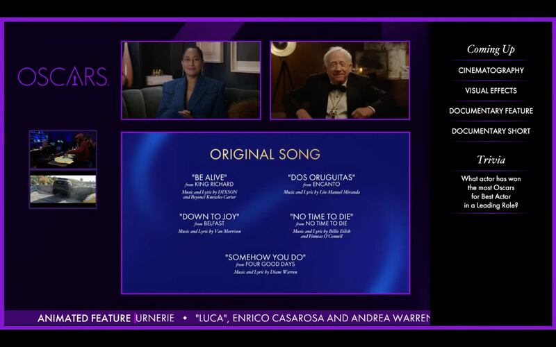 Dos oruguitas’, canción interpretada por Sebastián Yatra para la película ‘Encanto’ comparte categoría con ‘Be Alive’ de King Richard, ‘Down to Joy’ de ‘Belfast’, ‘No Time To Die’ de ‘No Time To Die’ y ‘Somehow You Do’ de ‘Four Good Days’.