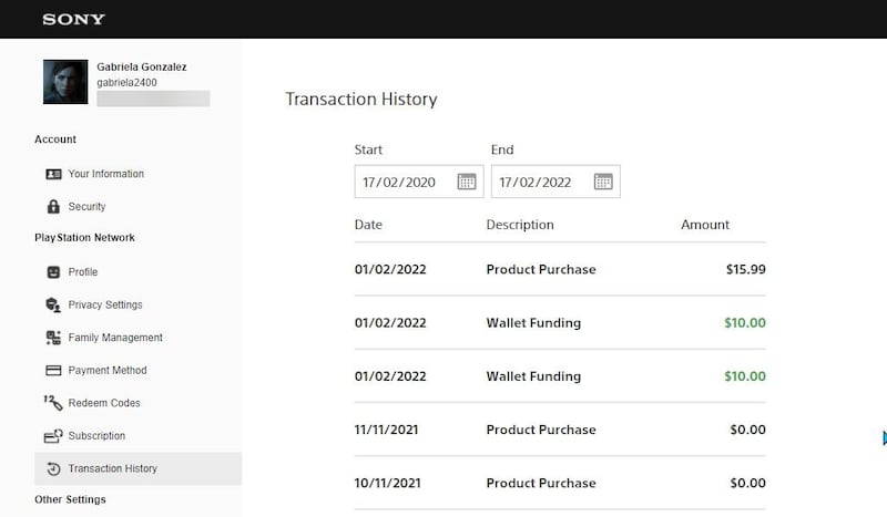 En esa sección, se debe seleccionar Historial de transacciones en el panel de la izquierda y elegir un intérvalo de fechas. Sony solo permite elegir un desde y un hasta con fechas exactas eligiéndolas en el calendario.