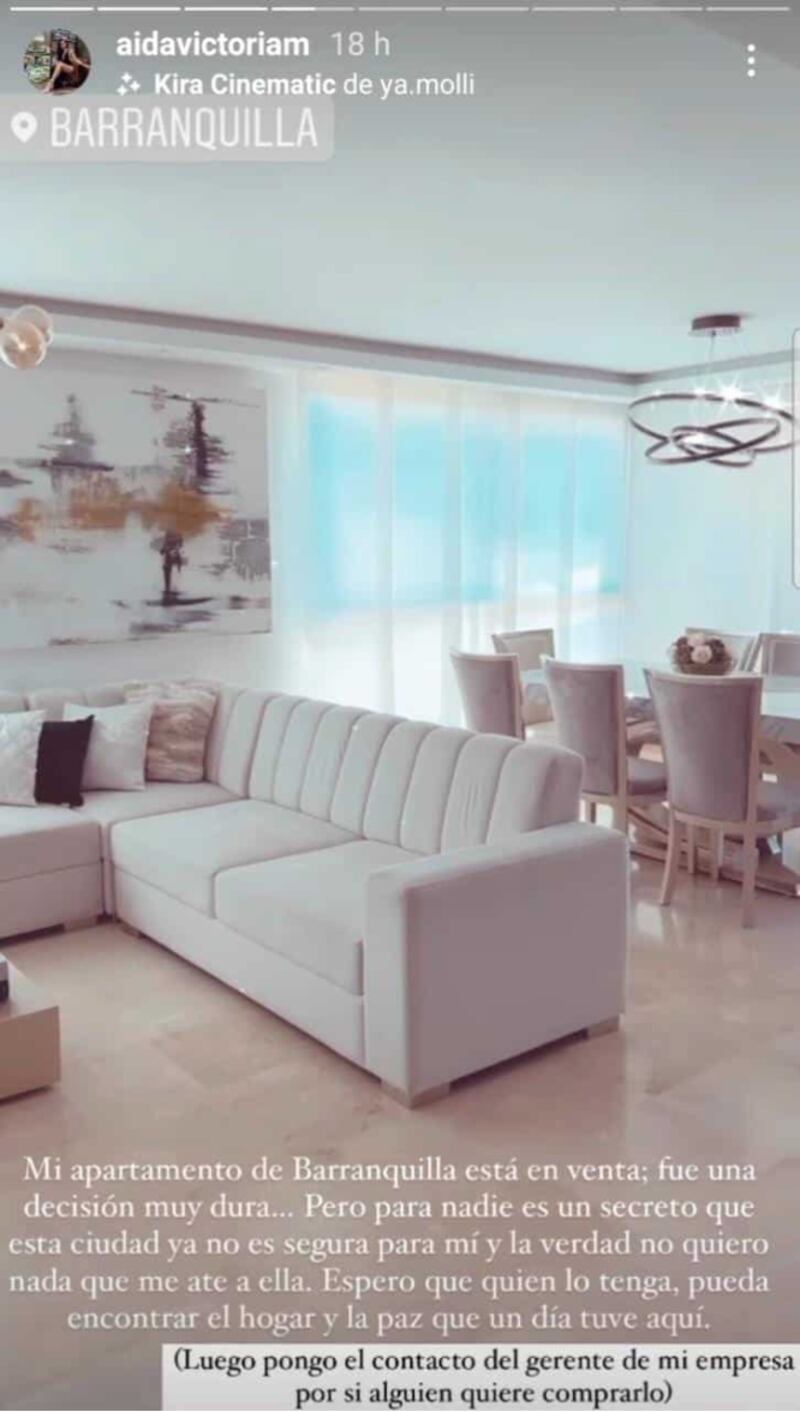 Así las cosas, Aída Victoria no dio mayores detalles sobre dónde se radicará después de su salida de la capital de Atlántico, sin embargo, aseguró por medio de una historia en Instagram que próximamente dejará disponible el número telefónico del gerente de su empresa, quien será el encargado de hacer la venta del inmueble.
