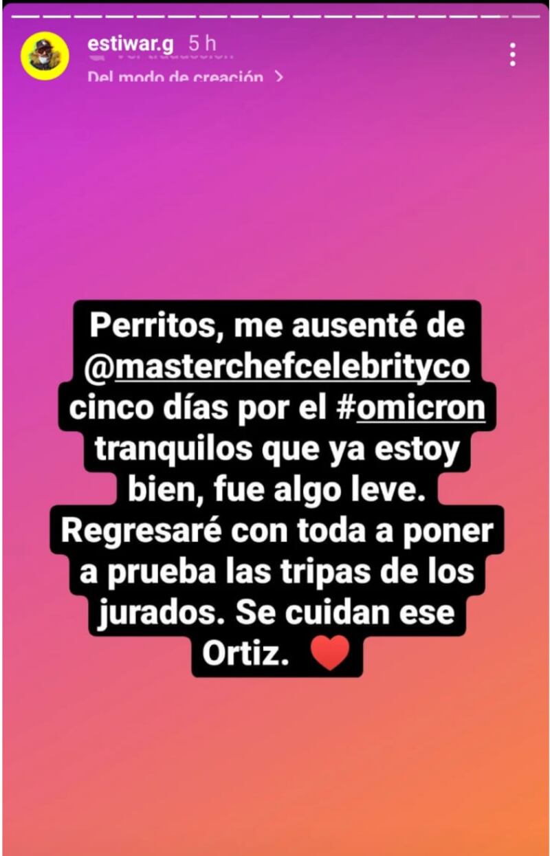 Sobre el tema, fue el mismo Estiwar quien se encargó de aclararle a sus miles de seguidores la razón por la que no ha estado presente en MasterChef. Según una publicación hecha en sus historias de Instagram, tuvo que ausentarse debido que se vio contagiado de COVID-19, particularmente de la variante Ómicron, razón por la cual tampoco aparecerá en los capítulos próximos de la competencia.