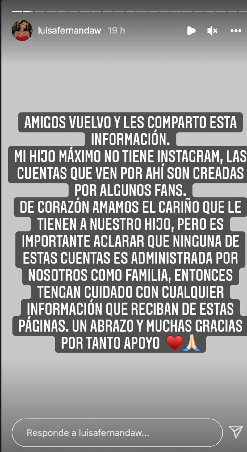 A partir del nacimiento del pequeño varios seguidores han querido crearle páginas y cuentas subiendo y compartiendo fotos del pequeño, cosa que ninguno de los dos famosos ve como malo, sin embargo, si consideran que es importante aclarar que son páginas creadas por fanáticos y no manejadas por ninguno de los dos o alguien de su familia, por eso miso Luisa creyó pertinente tener que aclarar la situación “amigos vuelvo y les comparto esta información, mi hijo máximo no tiene instagram, las cuentas que ven por ahí son creadas por algunos fans. De corazón amamos el cariño que le tienen a nuestro hijo, pero es importante aclarar que ninguna de estas cuentas es administrada por nosotros como familia, entonces tengan cuidado con cualquier información que reciban de estas páginas. un abrazo y muchas gracias por tanto apoyo” terminó por decir la empresaria.
