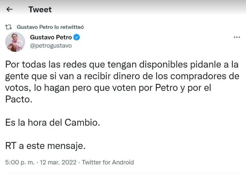 El contexto de la pelea parte desde la denuncia de votantes por compra de votos que beneficiaban a ciertos candidatos, entre tanto Petro usó esta información a su favor a forma de broma, y usó Twitter para manifestarlo.