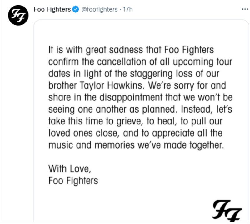 “Con gran tristeza, Foo Fighters confirma la cancelación de todas las fechas de nuestra gira debido a la impactante pérdida de nuestro hermano Taylor Hawkins. Lo sentimos y compartimos la decepción de no vernos los unos a los otros como habíamos planeado. En su lugar, tomemos este momento para llorar, para acercamos a nuestros seres queridos y para apreciar toda la música y los recuerdos que hemos construido juntos”, escribieron.
