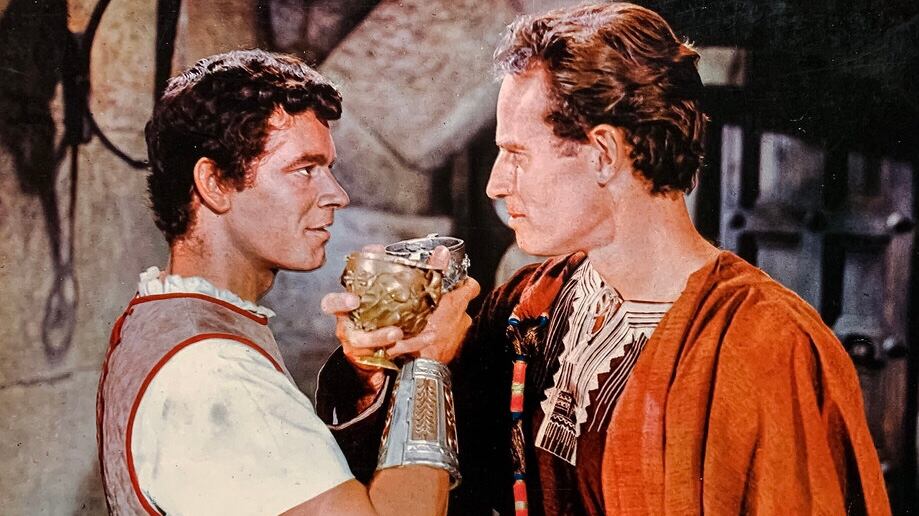 En una de las escenas de la película de cuatro horas de duración, Ben-Hur y Messala tienen una conversación importante en la que después hacen un brindis cruzando sus copas y entrelazando sus brazos.