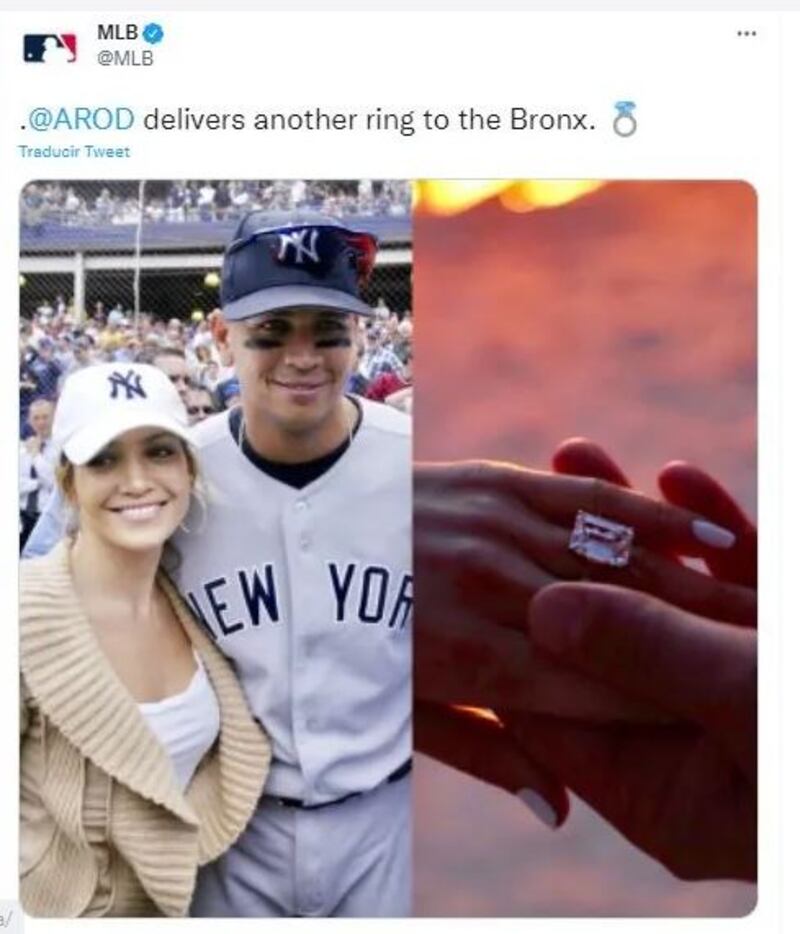 Alex Rodríguez le dio el quinto anillo de compromiso. Foto: Twitter