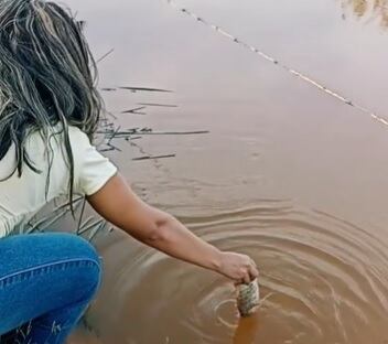 Acto seguido pregunta a la chica su nombre, mientras esta sostiene otro pescado en la mano para alimentarlo, y le pide que de manera peculiar mueva el agua con él mientras le llama por su nombre.