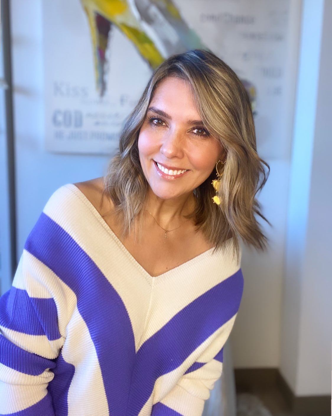 La periodista lució una blusa en rayas convexas en las tonalidades blanca y morada, con un pie de publicación, corto, pero lleno de jocosidad para el día a día. “Demorada para un cambio 💜✨✨”, escribió.