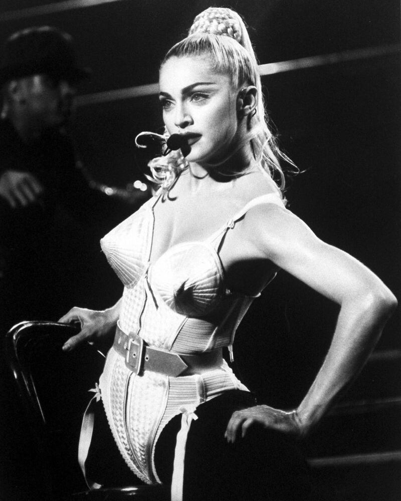 Este par de accesorios recuerda al famoso corsé cónico Gaultier que Madonna usó durante la gira Blond Ambition World Tour de 1990 que tanto llamó la atención en su momento y que actualmente es un ícono clásico de la moda. Y si bien la versión conocida es la de color plateado, la cantante también llegó a lucir una en tonos dorados como en el caso del accesorio de Paulina Vega.
