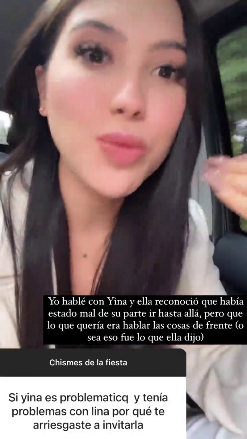 La influencer comentó que a pesar de las riñas que había entre ambas, no podía dejar de invitar a ninguna ya que ambas son grandes amigas de ellas. También redactó que Yina había reconocido que se había portado mal en la fiesta y que solo había asistido para dejar las cosas claras con Tejeiro.