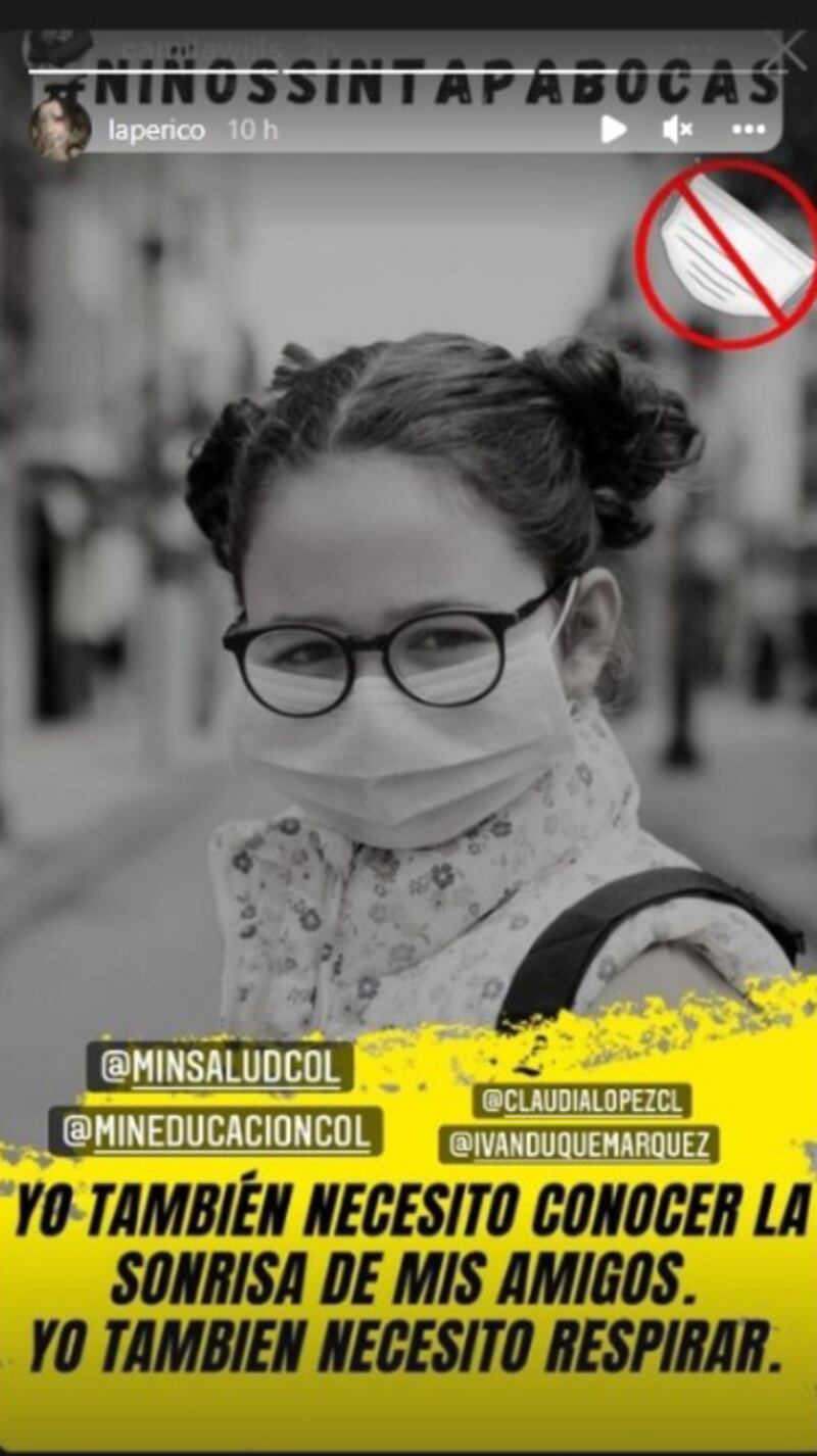 “Yo también necesito conocer la sonrisa de mis amigos. Yo también necesito respirar”, se lee en la publicación, que también tiene etiquetados a los nombres de usuario del presidente de Colombia, Iván Duque; la alcaldesa de Bogotá, Claudia López; la cuenta del Ministerio de Salud y la del Ministerio de Educación de Colombia en Instagram.