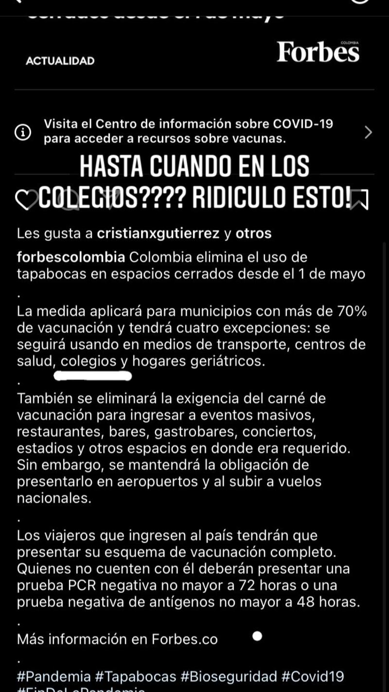 La actriz hizo captura de pantalla de una noticia de Forbes Colombia en el que anunciaba que Colombia eliminaría el uso obligatorio de tapabocas en espacios cerrados desde el 1 de mayo, pero ella se enfocó en el párrafo que indicaba que en los colegios no aplicaba esta nueva directriz. “Hasta cuando en los colegios???? Ridículo esto!”, escribió en una historia.
