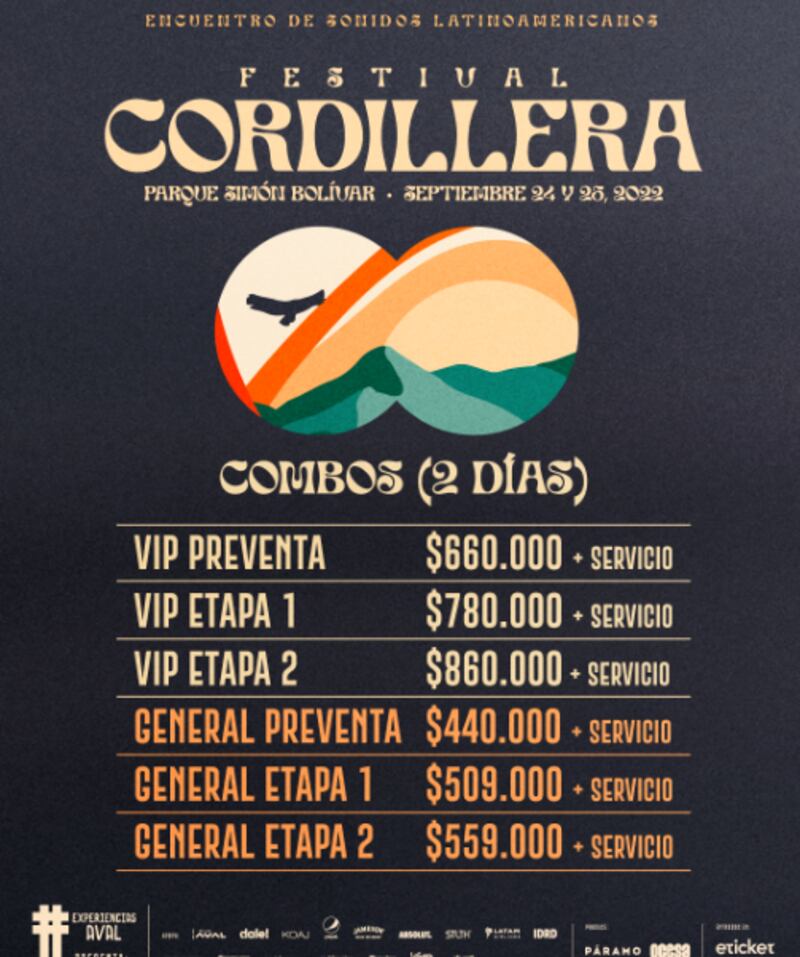 Ocesa Colombia y Páramo Presenta, se unen para presentar la primera edición del Festival Cordillera, un evento donde se vivirán los sonidos latinoamericanos junto a sus mayores leyendas y donde los himnos de generaciones de fanáticos resonarán por todo el continente. Maná, Caifanes, Los Fabulosos Cadillacs, Zoé, Café Tacvba, Draco Rosa, Julieta Venegas, Los Auténticos Decadentes, Molotov, Mon Laferte, Babasónicos, Toto La Momposina, No Te Va Gustar, The Wailers, Piero, La Etnnia y más, serán los protagonistas del Festival Cordillera.