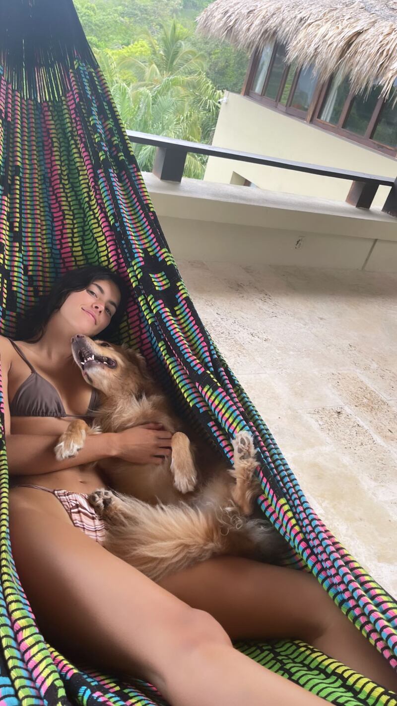 En otras tomas también se puede ver a la modelo descansando en una hamaca junto a Dory, quien se muestra muy alegre de estar con su dueña, reposando a su lado y protagonizando una tierna fotografía.