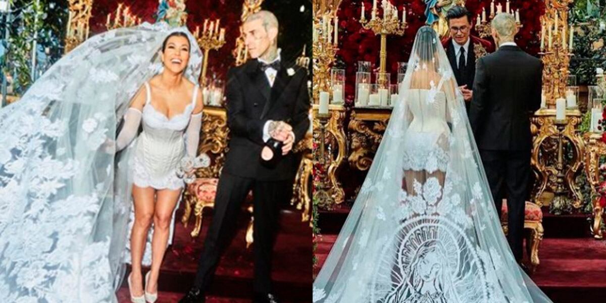 Kourtney llevó un minivestido blanco lencero, con un velo extralargo, que se llevó todas las críticas en redes, pero que tiene un poderoso significado.