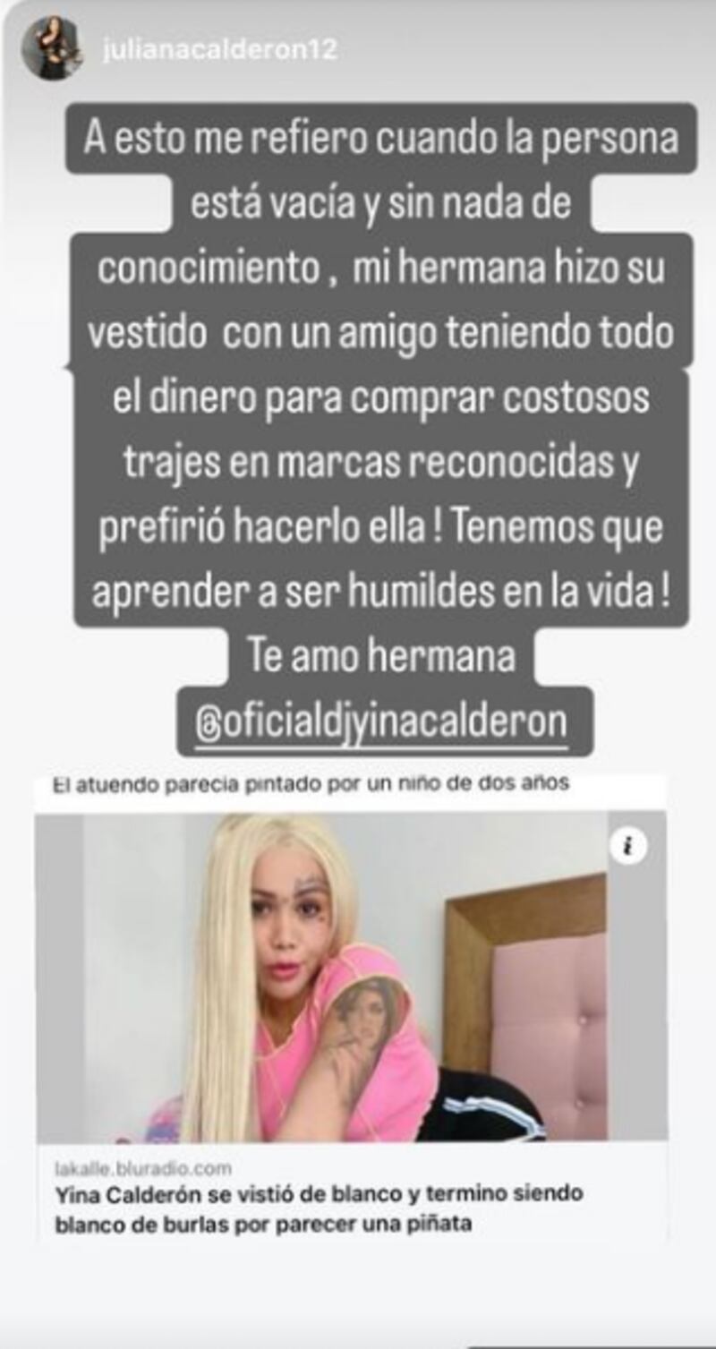 A pesar de tremendas críticas, ella llegó al evento completamente orgullosa de su atuendo, afirmando que le había apostado a la creatividad y dejando claro que ella siempre iba en contra de la etiqueta. Ahora, en las redes sociales de su hermana, Juliana publicó un comunicado de un medio que criticó a Yina titulando la noticia “Yina Calderón se vistió de blanco y terminó siendo blanco de burlas por parecer una piñata” a lo que Juliana contestó: