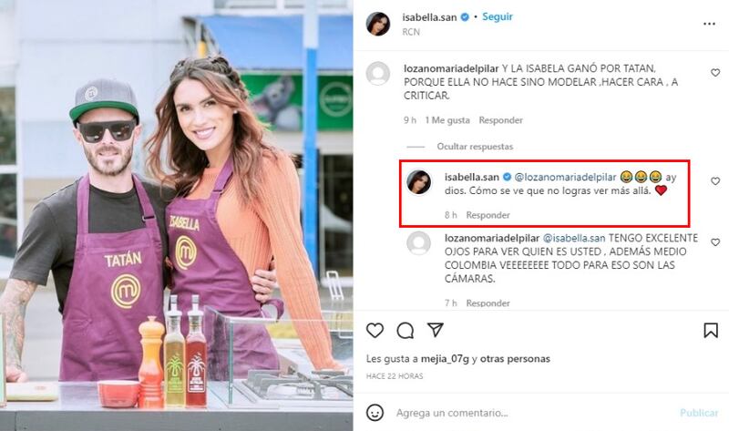 Seguidamente, el mismo usuario vuelve a provocar a Isabella Santiago, comentando que ella ganó gracias a Mejía y no por su propio mérito ya que lo único que hizo fue “modelar” y “criticar”. Ella no se quedó callada y volvió a responderle: “Ay Dios, como se ve que no logras ver más allá”.