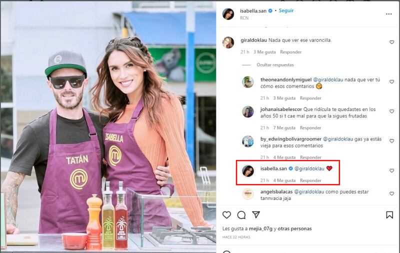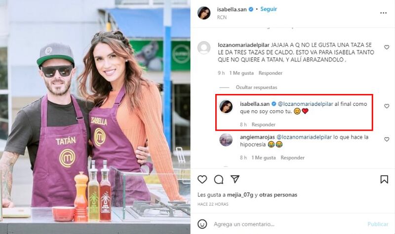 Pero tal parece que Isabella Santiago se hartó de los comentarios negativos y decidió responderle a algunos usuarios de Instagram que le dejaron mensajes de repudio en su última publicación en la que aparece junto a su compañero de cocina Tatán Mejía mientras celebraban su ascenso al top 10 del concurso.
