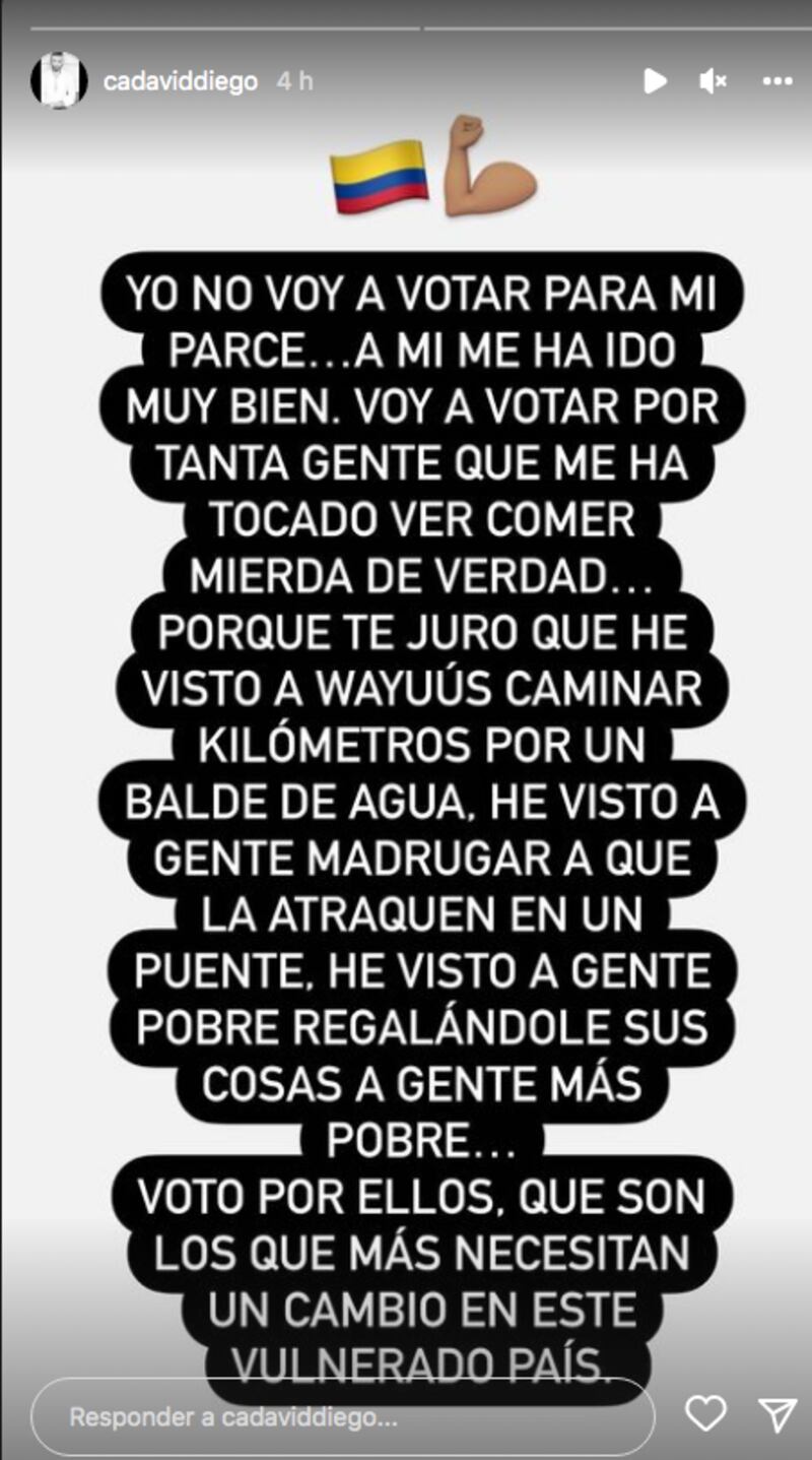 “Yo no voy a votar par mí, parce. A mí me ha ido muy bien. Voy a votar por tanta gente que me ha tocado ver comer mie**a de verdad. (...) Voto por ellos que son los que más necesitan un cambio en este vulnerado”, comentó Cadavid por medio de sus historias de Instagram.