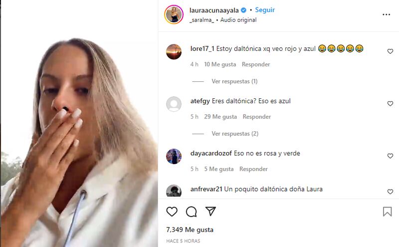 “Eso no es rosa y verde”, “Un poquito daltónica doña Laura” y “Eres daltónica porque yo veo rojo y azul” son algunos de los mensajes que se pueden leer en la sección de comentarios.