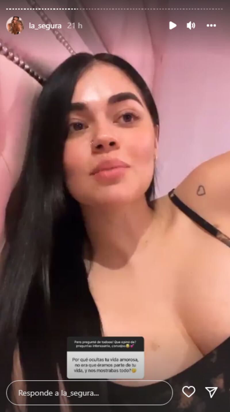 Cuando uno de sus seguidores le preguntó si estaba feliz con alguien a su lado, La Segura se limitó a publicar un video en el que sale cantando una frase de la canción de Bad Bunny, ‘Ojitos lindos’, que al parecer refleja cuál es su situación sentimental actualmente.