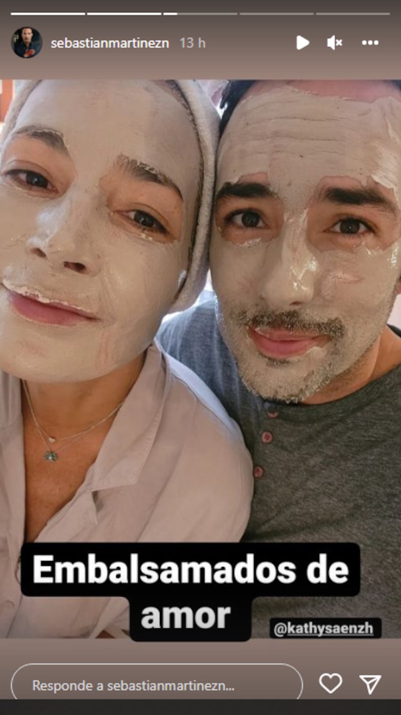 Sebastián Martínez concluyó su rutina de belleza publicando una foto junto a Kathy Sáenz en la que ambos aparecen muy juntos y mostrando su rostro cubierto por la mascarilla mientras ambos sonríen a la cámara. El actor también escribió un tierno mensaje en la imagen: “Embalsamados de amor”.