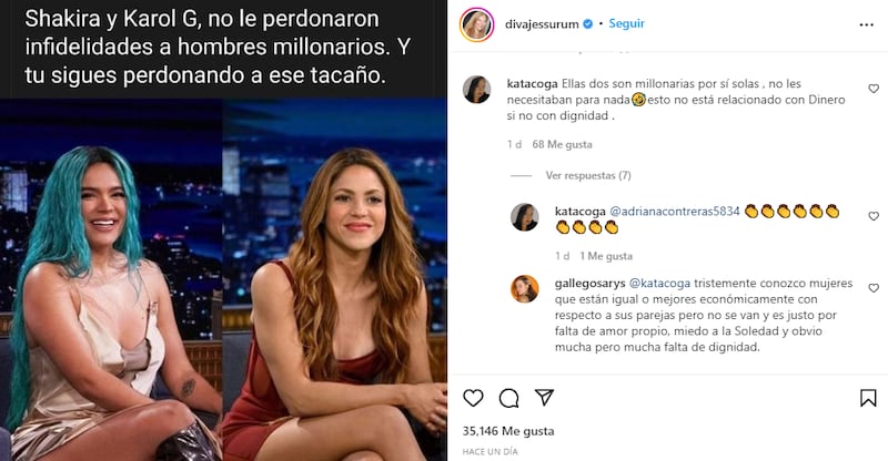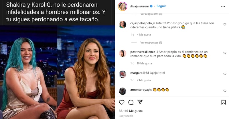 Varios de los seguidores de Diva Jessurum no perdieron el tiempo y se sumaron para dar su opinión sobre la reflexión compartida, además de pronunciarse sobre la separación de la pareja como tal, mostrando varios mensajes en apoyo a Shakira e incluso a Karol G, dejándolas ver como un par de mujeres empoderadas.