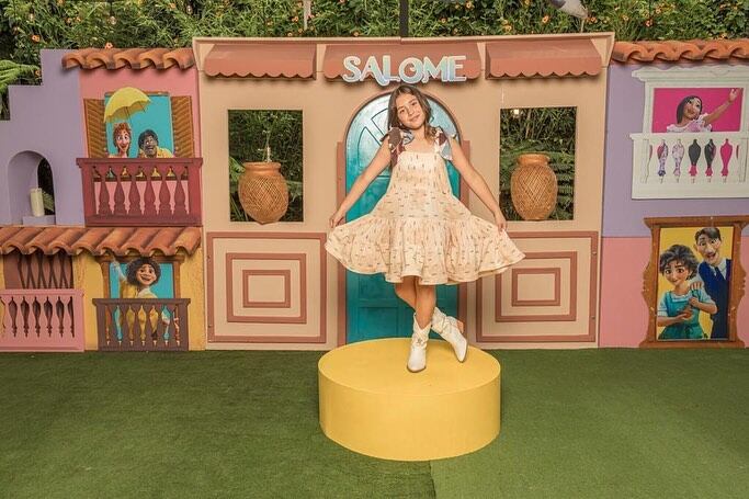 Este año el cumpleaños, número 9, estuvo enfocado en la familia Madrigal, la misma de la película ganadora del premio Oscar ‘Encanto’. Pues en el área del pastel, de tres pisos de alto, había un compendio de fachada similar al de la trama de Disney, solo que con su nombre en gigante.