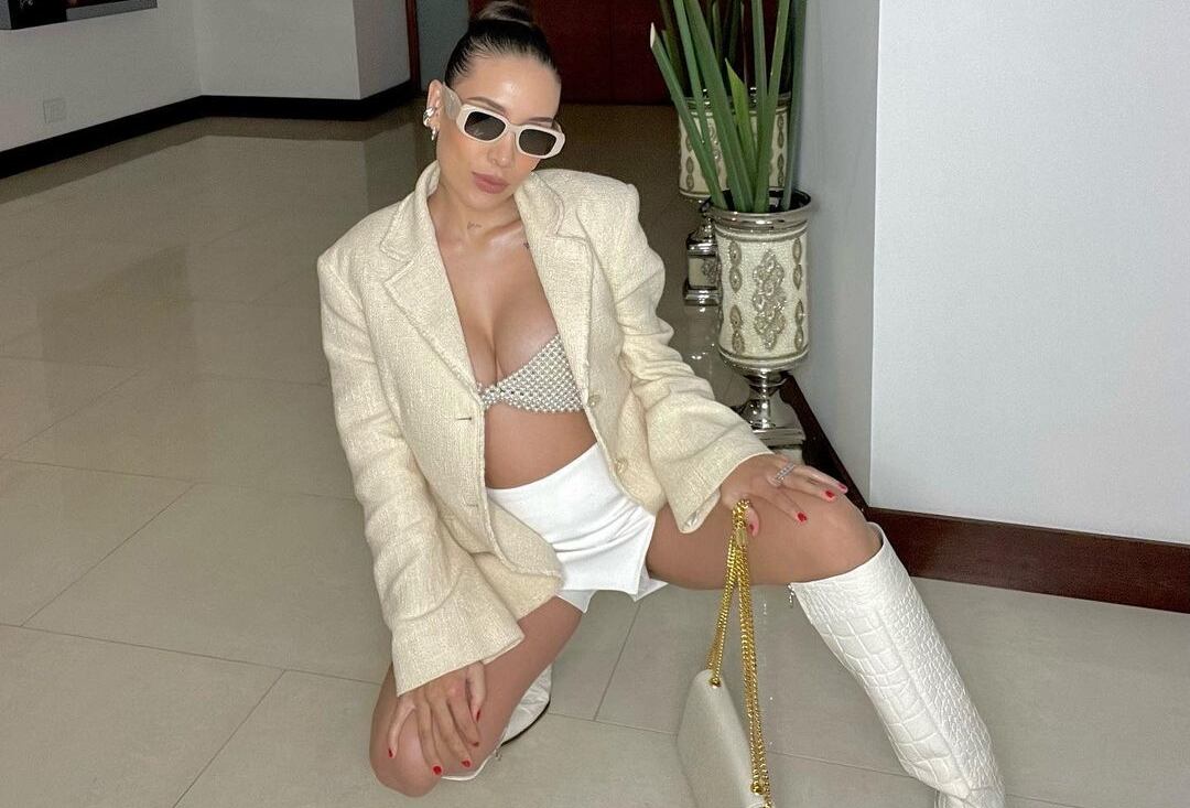 Una chaqueta en lana, para el frío de Bogotá, unas botas blancas tipo piel de cocodrilo, con un sostén brillante decorado en alta pedrería, unas gafas oscuras y una cartera de mano de la casa Yves Saint Laurent es todo el componente del outfit.