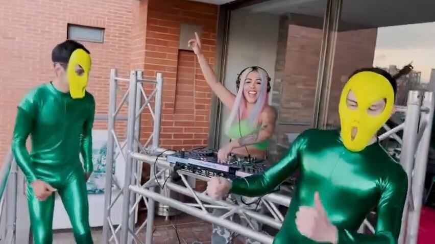 Esta vez la artista dejó de lado su recién estrenada camioneta rosada para pararse de nuevo frente a los mezcladores y junto a dos hombres vestidos como unos completos extraterrestres en color verde y con mascaras alargadas.