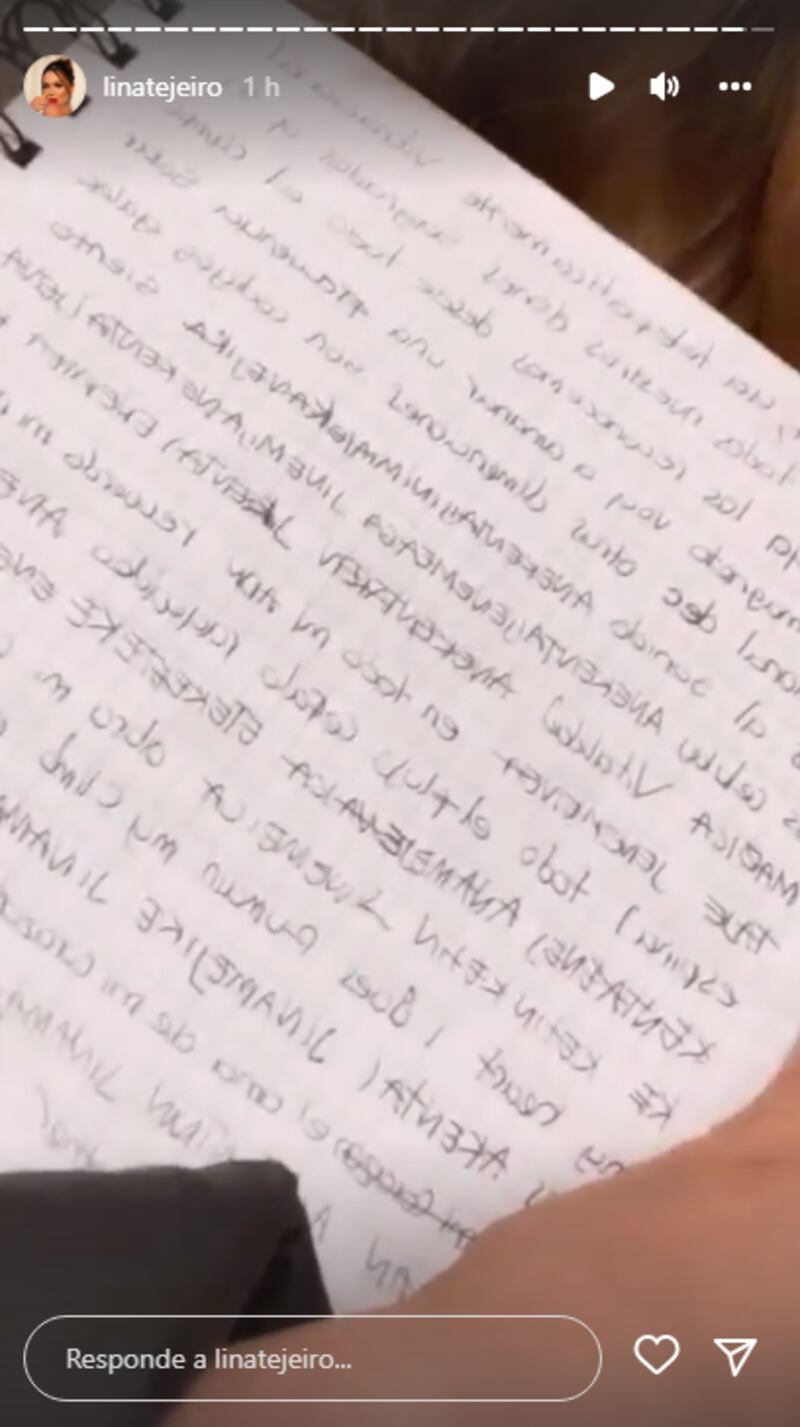 Y a través de una de sus historias contó cómo fue su proceso de preparación para poder lograr el resultado del divertido video. “Lo que más me preguntan es cuánto me demoré aprendiéndome ese TikTok. Como tres días. No, mentiras, más. Lunes, martes, miércoles, jueves... Cuatro días. Lo escribí y me lo aprendí”, dijo Lina Tejeiro mientras mostraba la libreta donde escribió las palabras de Mafe Walker.