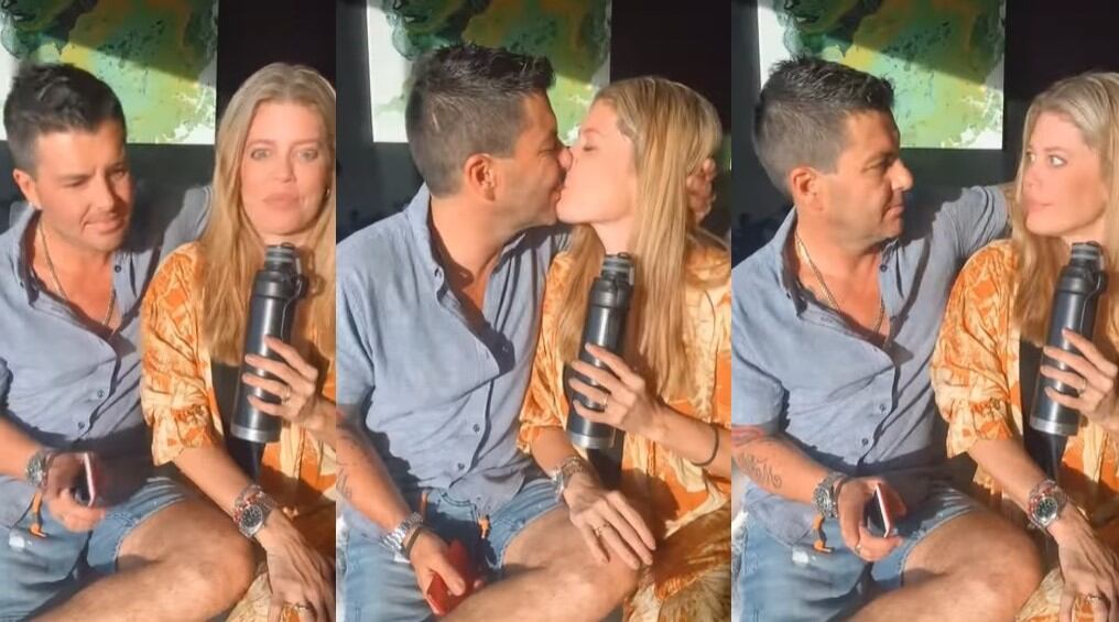 En la imagen salen ambos sentados, pero ella con una botella simulando ser un micrófono y diciendo en perfecta mímica “Esta canción se llama ‘Todo lo que amo de mi esposo’”.