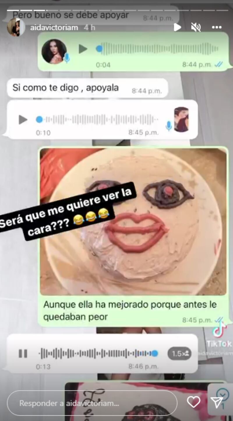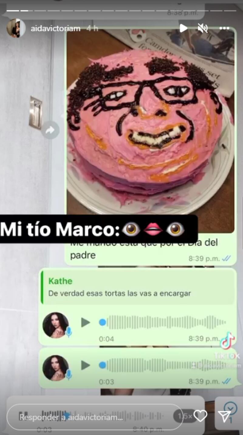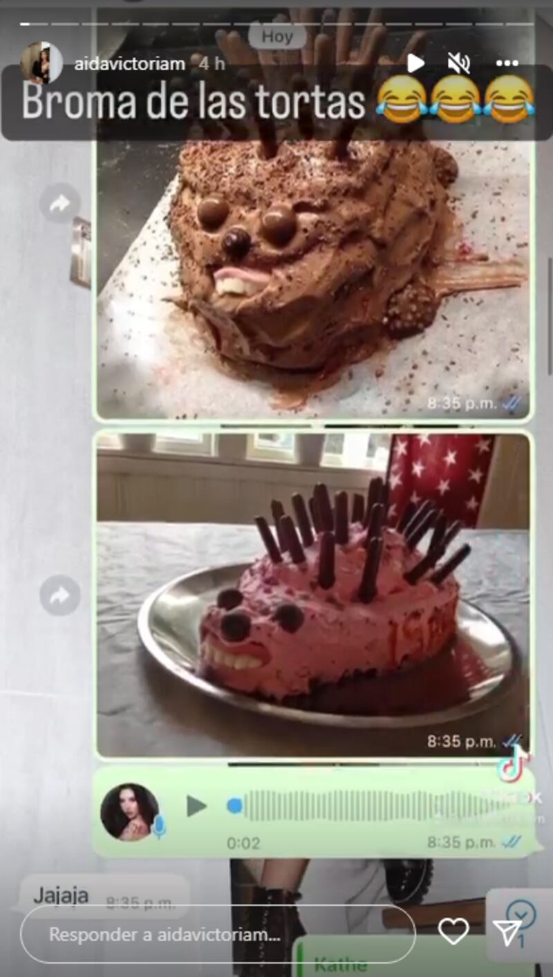 A través de su cuenta de Instagram, Aída Victoria Merlano decidió sumarse a la tendencia tomando como víctima a uno de sus familiares. En varias de sus historias muestras las capturas de pantalla de una conversación con su prima en donde le presenta varias propuestas de tortas poco estéticas que estaba meditando encargar para la celebración del Día del Padre, que tendrá lugar el 26 de junio.