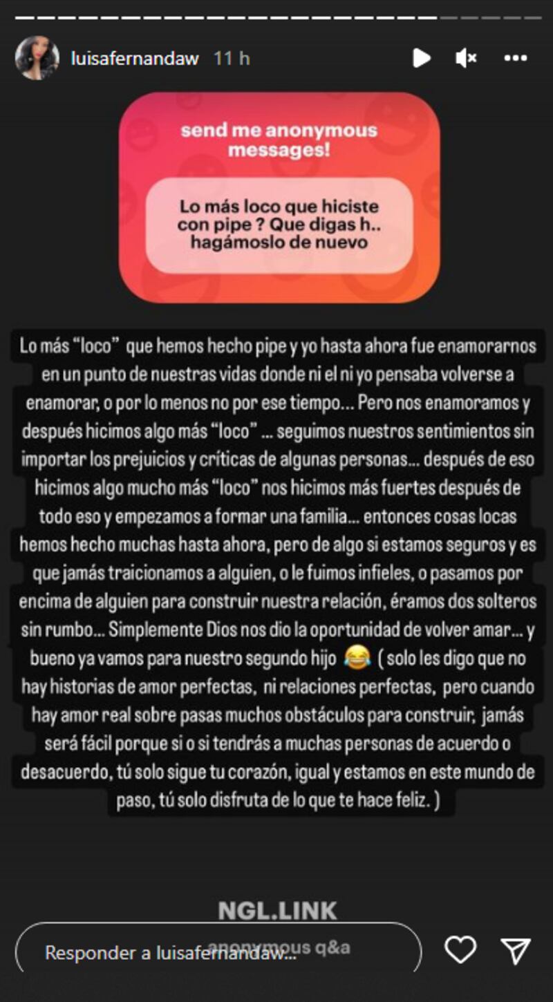 A través de su cuenta de Instagram, Luisa Fernanda W respondió varias preguntas anónimas de sus seguidores, con algunas de ellas referentes a su embarazo y su etapa de maternidad. Pero uno de los usuarios de la red social decidió inclinarse por un tema de parejas al preguntarle qué es lo más loco que ha hecho con Pipe Bueno.