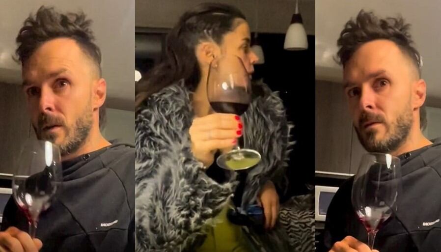 En el clip con una copa de vino en la mano es como aparece Tatán Mejía, mientras que con la mirada le hace señas a Maleja Restrepo, para que voltee a mirar muy disimuladamente algo que está ocurriendo.