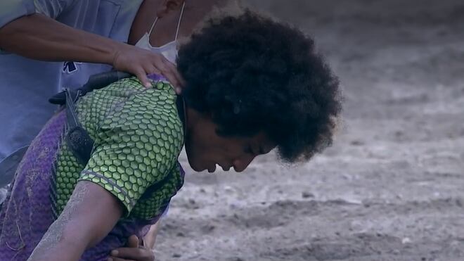 Tarzan quedó tirado en el piso alegando dolor en su cuello, la brigada de seguridad tuvo que intervenir y al ver la dificultad que el concursante tenía para toser y hablar, se lo llevaron en ambulancia para determinar la gravedad del golpe.