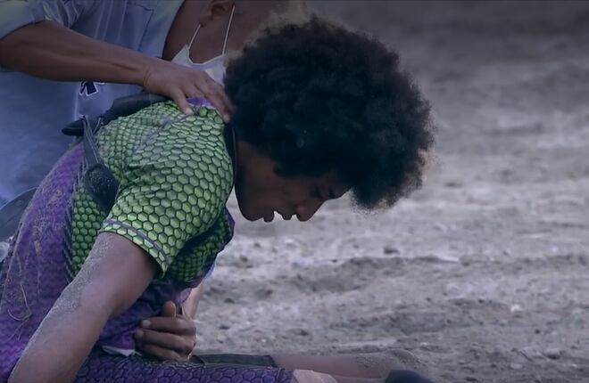 Tarzan quedó tirado en el piso alegando dolor en su cuello, la brigada de seguridad tuvo que intervenir y al ver la dificultad que el concursante tenía para toser y hablar, se lo llevaron en ambulancia para determinar la gravedad del golpe.