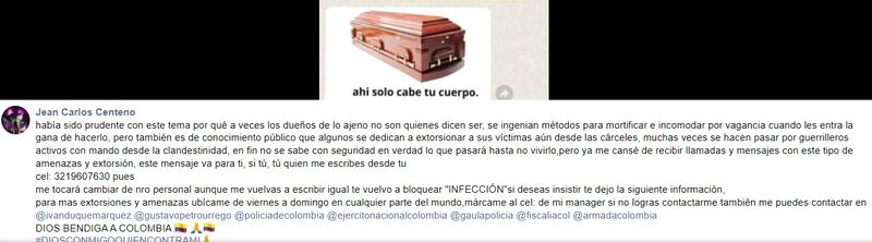 Además, expresó que muchas veces este tipo de extorsiones a través de memes y mensajes intimidantes. “vienen desde la cárcel, o se hacen pasar por guerrilleros activos desde la clandestinidad usando métodos para mortificar e incomodar por vagancia cuando les da la gana de hacerlo”.