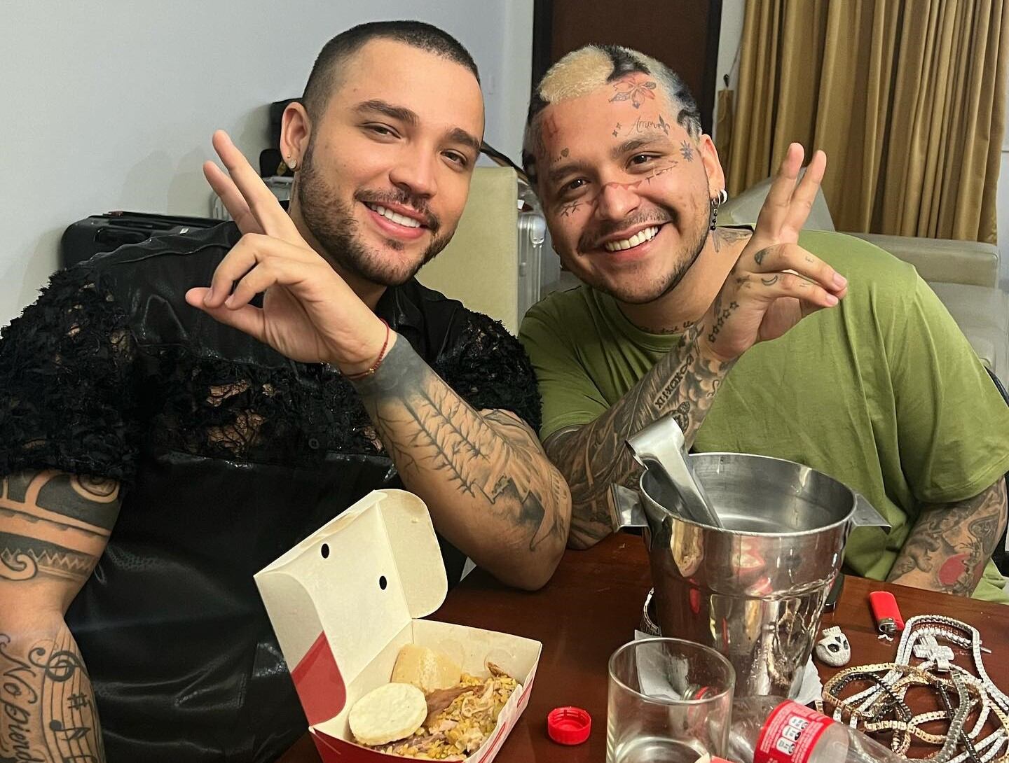“Enseñándole a comer lechona al viejo Cris Nodal 😂😂 que buena charla mi hermano👊🏻 Dios bendiga siempre ese increíble talento y esa hermosa voz”, escribió al pie de publicación el intérprete de ‘Dulce Pecado’.